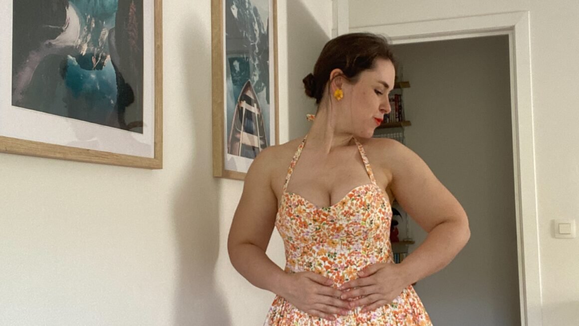 Niveau longueur, pour mon 1m59 elle est parfaite. Je n’apprécie pas particulièrement mes jambes et surtout mes cuisses donc ce genre de coupe et de longueur font mon plus grand bonheur. Si vous êtes plus grande que moi, elle vous arrivera au-dessus du genou mais moi, j’aime bien ces longueurs en-dessous du genou lorsque ce sont des robes dans ce style-ci, très ajustée sur le buste et puis avec pas mal de volume sur le bas. Niveau bretelles, petit twist pour moi qui a du mal à nouer des bretelles toute seule à la même hauteur et avec des nœuds symétriques, je n’attache que les parties avant autour du cou, comme un dos nu et les parties arrières des bretelles sont rentrées dans la robe, ni vu ni connu 😉