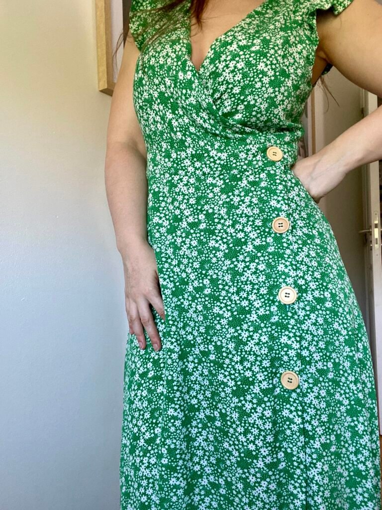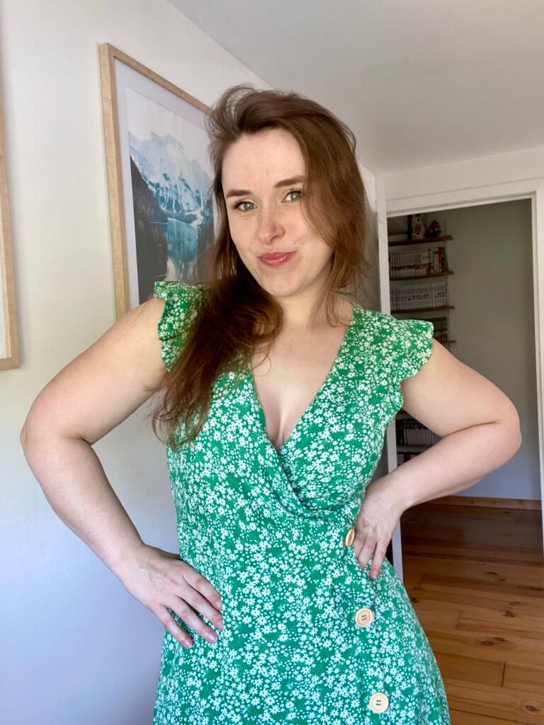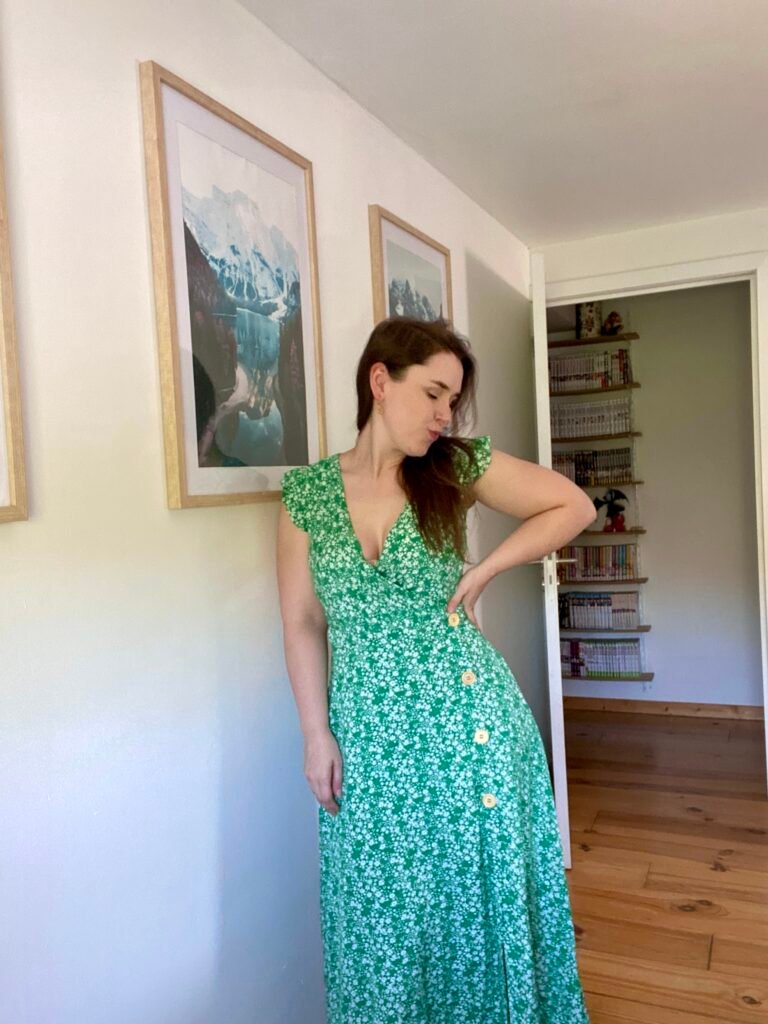 Alors, clairement, la robe Alix est pas prévue pour les débutants en couture car elle demande pas mal de techniques mais elle est super chouette à coudre. Ces petits volants en guise de manches et son cache-coeur m’ont littéralement fait fondre mais le challenge, c’était le décolleté. En effet, sur toutes les photos que j’ai vu, les femmes qui la portait avaient une poitrine moins imposante que la mienne et le cache-coeur, c’est pas toujours notre meilleur ami. Soit il est trop fermé et ça aplatit littéralement la poitrine, soit il est mille fois trop décolleté et même avec un petit point, il ne se met pas bien. Ici, à ma grande surprise, c’est juste un tout tout tout petit peu trop décolleté mais rien de méchant. Je vais coudre une petite pression invisible pour être plus à l’aise au quotidien mais la robe s’adapte à pas mal de poitrines.